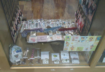 そしてもう一つのボックスは商品を入れ替えてきました。がま口ポーチをジャーマンファブリックのバネポーチに変更です。先日完成したスリーシスターズを今回ディスプレイしてきましたよ!