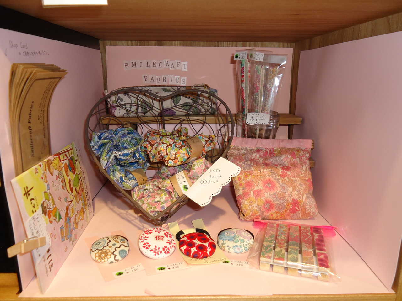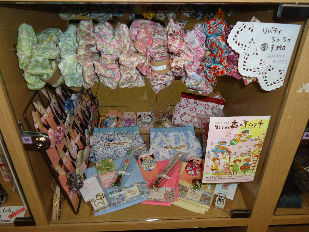 今回は動きのない商品を引き上げて、ジャーマンファブリックのポーチを代わりに置いてきました。シュシュの動きが、前回のブースから移動して以来、全く止まってしまいました。