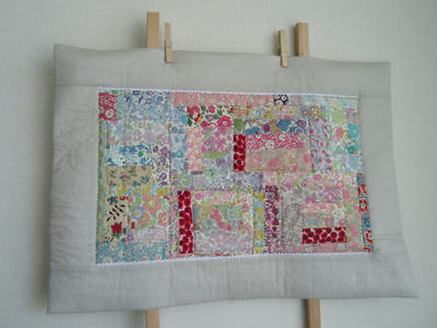 スクラップキルトです。ハギレを思いのまま繋ぎ合わせてミシンパッチしました。
