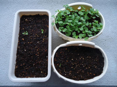 長いプランターがミックスレタス。小さめのプランターの上は小松菜。