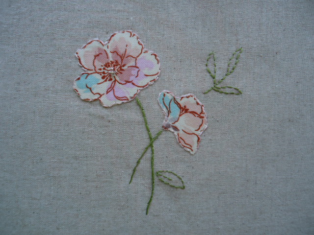 花柄のプリントを切り取ってモチーフにし、リネン地にあしらってみると、なんともいい感じです。
