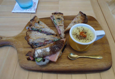 カフェということで、今回はベーコンと季節野菜のホットサンドとホットハニージンジャーミルクを頂きました。食べやすいお大きさにカットしてあって嬉しかったです。コーンスープもついていて、ランチにもぴったりです!