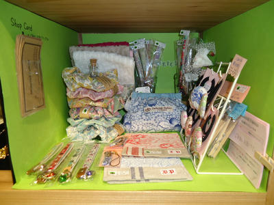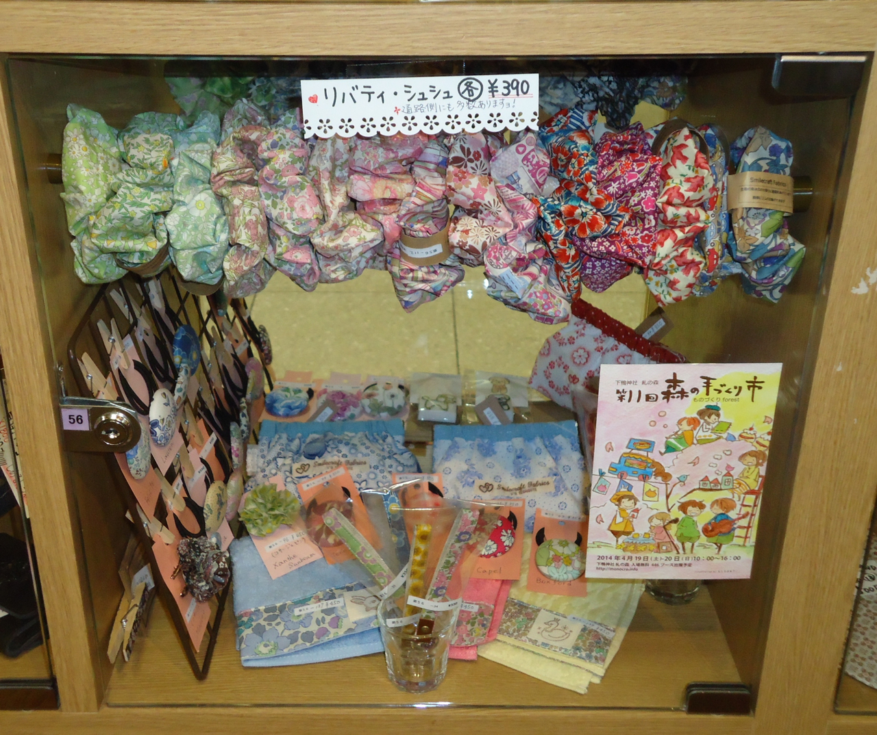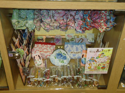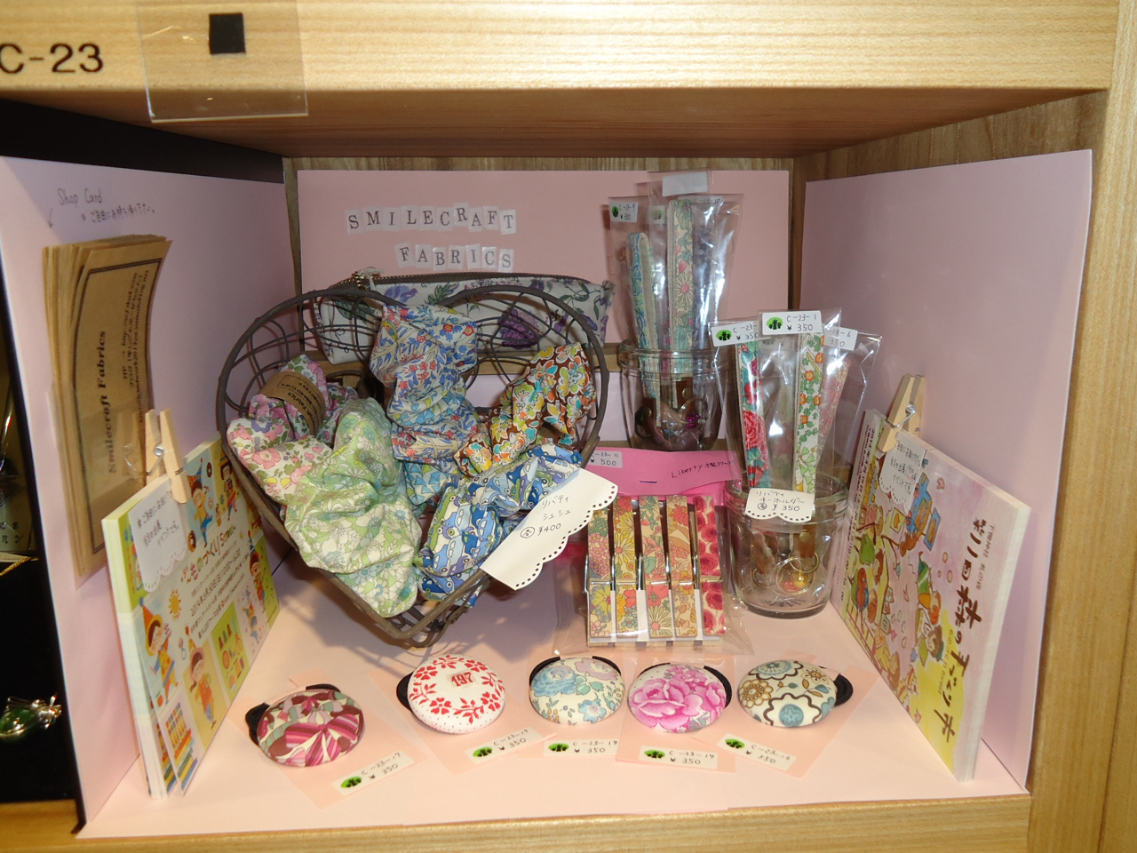 そしてもう一つのボックスは商品を入れ替えてきました。がま口ポーチをジャーマンファブリックのバネポーチに変更です。先日完成したスリーシスターズを今回ディスプレイしてきましたよ!