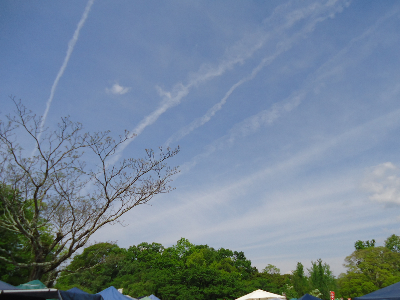 空にはいくつもの飛行機雲。ピクニック気分で店頭に立っていましたよ。
